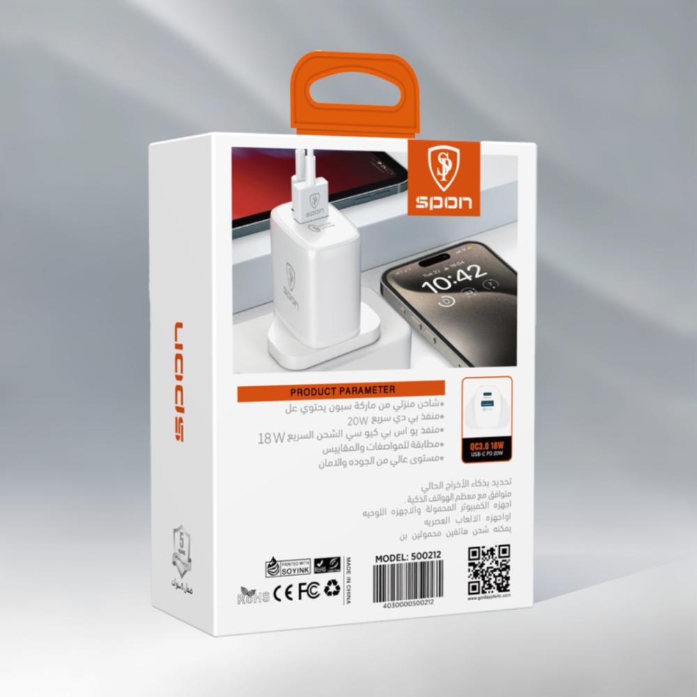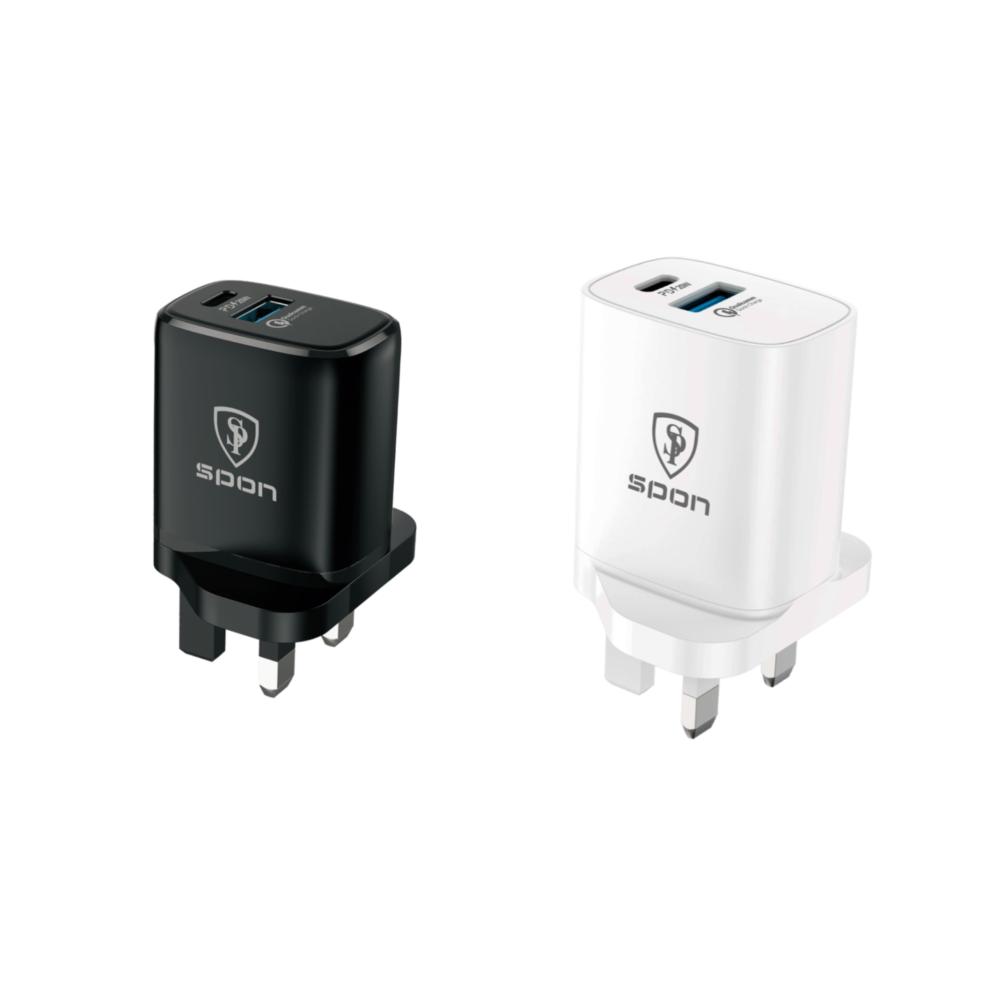 شاحن جداري بقوة 38W + كيبل للشحن السريع ماركة سبون باللون الاسود والأبيض